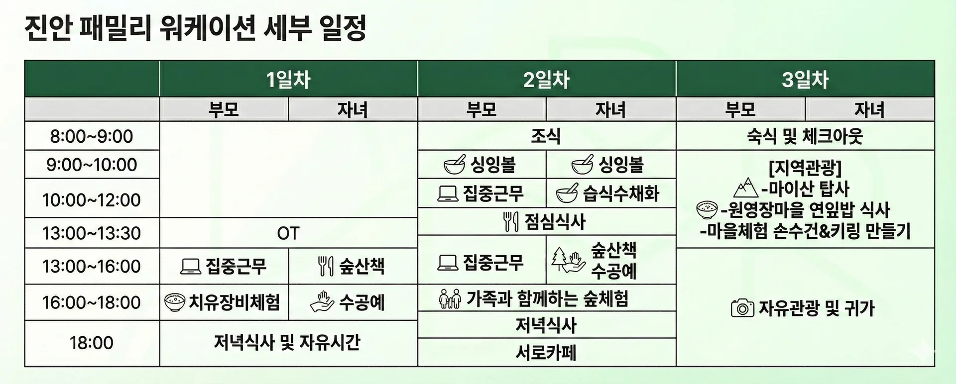 업무 전후에는 가족이 함께 온전히 힐링할 수 있는 시간을 구성했습니다.