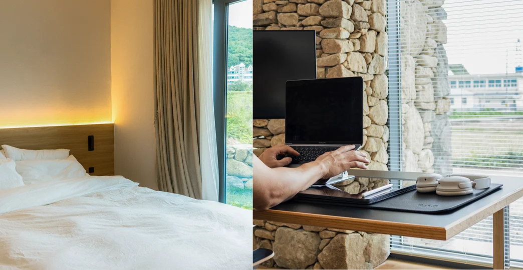 워케이션의 본래 취지는 새로운 환경에서 창의성과 집중력을 높이고, 적절한 쉼을 추구하는 것입니다. 하지만 현실은 그렇지 않은 경우가 많아요. 숙박 시설의 불안정한 인터넷 환경, 업무에는 적절하지 않은 의자와 책상, 휴식 공간과 분리되지 않은 업무 공간 등 오히려 업무 효율이 떨어질 수 있습니다.