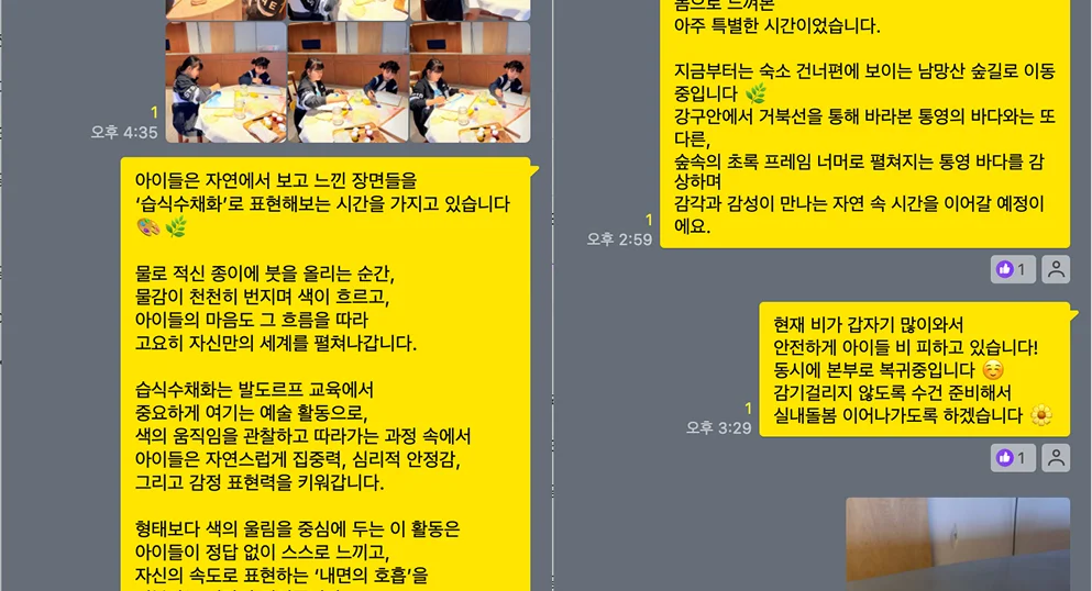 🧐 부모 안심 알림 시스템도 있어요! 아이 돌봄 시간 동안 현장 활동사진과 소식을 실시간으로 전달해, 아이 걱정 없이 업무에 몰입할 수 있도록 지원하고 있어요.