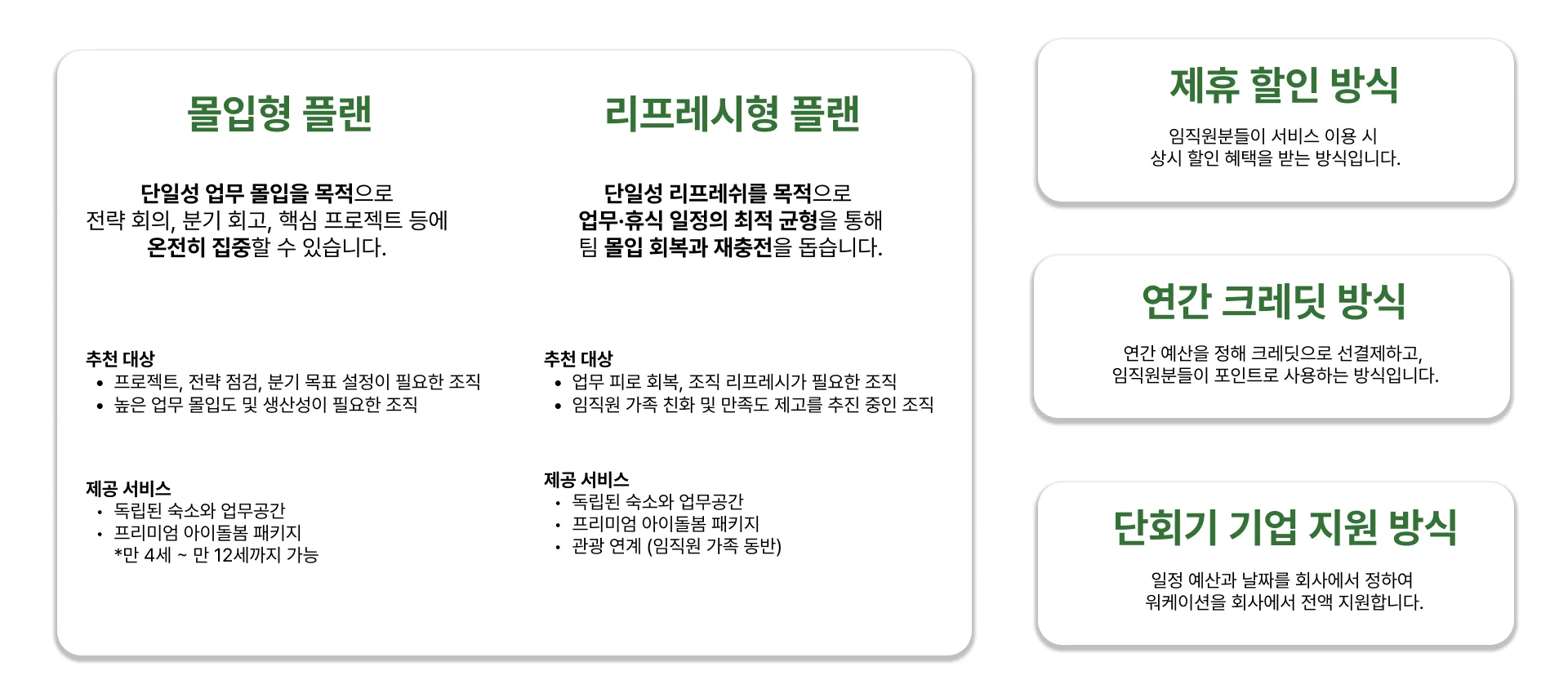 업무 몰입에 집중하는 ‘몰입형’, 조직 리프레시를 돕는 ‘리프레쉬형’ 등, 기업이 원하는 수준과 방식에 맞게 맞춤형으로 구성할 수 있습니다. 또한 제휴 할인 방식, 크레딧 결제 방식, 단회기 기업 지원 방식 등 기업의 상황에 따라 유연하게 시작할 수 있습니다.